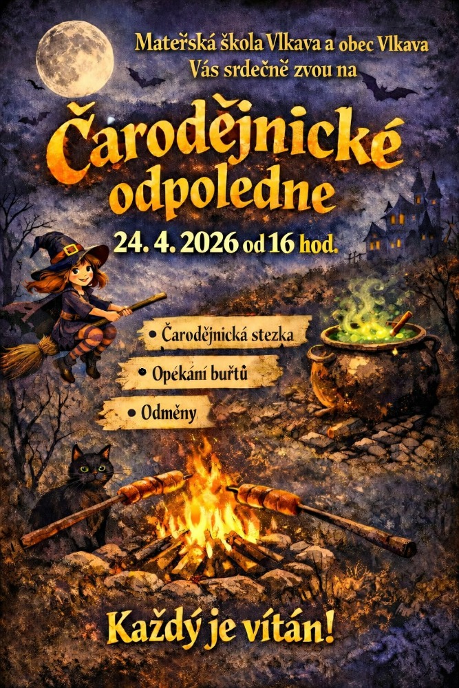 Zveme Vás do areálu a budovy Mateřské školy Vlkava na Čarodějnické odpoledne, které se koná dne 24.4.2026 od 16:00. Akce se koná za každého počasí.